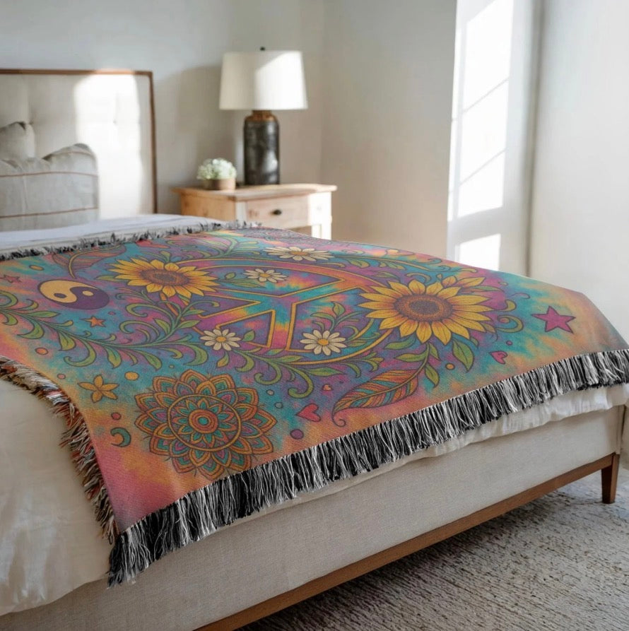 Wrap your space in the warmth of serenity. Adorned with peace signs, sunflowers, hearts, and flourishing plants, each design radiates harmony, comfort, and timeless bohemian beautyβbringing calm, character, and soul to any room.π»